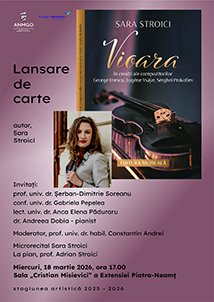 Academia Naţională de Muzică „Gheorghe Dima” Cluj-Napoca, Extensia Piatra-Neamţ, ne-a invitat, miercuri, 18 martie 2026, cu începere de la ora 17:00, la sala „Cristian Misievici”, la un eveniment editorial şi artistic de excepţie. Este vorba despre lansarea volumului „Vioara în creaţii ale compozitorilor George Enescu, Eugène Ysaÿe şi Serghei Prokofiev”, semnat de violonista şi autoarea Sara Stroici.