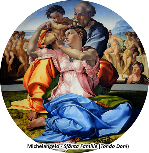 Şi oare cine dintre iubitorii de artă nu a auzit şi nu şi-a dorit să fie măcar o dată în viaţă în faţa nemuritoarei Sfinte Familii (Tondo Doni) a lui Michelangelo? Tabloul uluieşte în primul rând prin forma sa circulară şi în al doilea rând prin vivacitatea culorilor şi vigoarea caracteristică înaltei nobleţi morale a personajelor. Acestea sunt organizate într-o compoziţie cu linii curbe, care, împreună cu contrastul clar-obscur, conferă lucrării o senzaţie sculpturală.