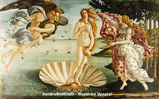 Cealaltă capodoperă mult admirată a lui Botticelli, Naşterea Venerei, denumită şi „icoana unei zeiţe dezbrăcate” este un alt „rebus” mitologic, în care apare zeiţa iubirii cu simbolurile sale complexe. Se pare că tabloul a fost realizat sub influenţa cunoscutului umanist florentin Angelo Poliziano, care în celebrele sale „Stanze” scrie: „O fată de o frumuseţe ireală stă în scoica purtată de vânturi lascive spre ţărm, întru bucuria cerurilor. Am putea jura că zeiţa tocmai a apărut din valuri. Sub tălpile ei sfinte şi divine nisipul ţărmurilor e acoperit de iarbă şi flori”. Nu poţi să nu observi cum aici, Botticelli, dovedind un talent de adevărat bijutier, acordă o mare atenţie zugrăvirii fenomenului mişcării, generat de suflul lui Zephyros şi observat în principal prin poziţia pletelor lui Venus sau a faldurilor rochiei femeii care îi întinde pelerina zeiţei.