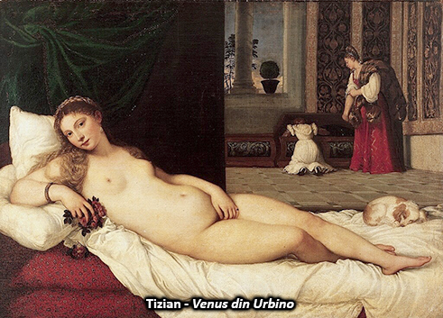 Altă întruchipare a zeiţei Venus este realizată la Veneţia de Tiziano în 1538, pânză ce va ajunge la Florenţa în 1631 sub denumirea Venus din Urbino. De această dată Venus este prezentată sub forma unei tinere cu părul lung, despletit senzual pe umeri. Am observat cu câtă graţie pictorul reia preţiosul detaliu al bucheţelului de trandafiri din mâna dreaptă a tinerei Venus, simbol al dragostei. În rest, arhicunoscuta pictură ne-o prezintă pe Venus goală, întinsă pe pernele dintr-un pat acoperit cu ţesături catifelate şi somptuoase. Lumina blândă cu tente roz a apusului pătrunde prin fereastră, colorând delicat carnaţia fetei.