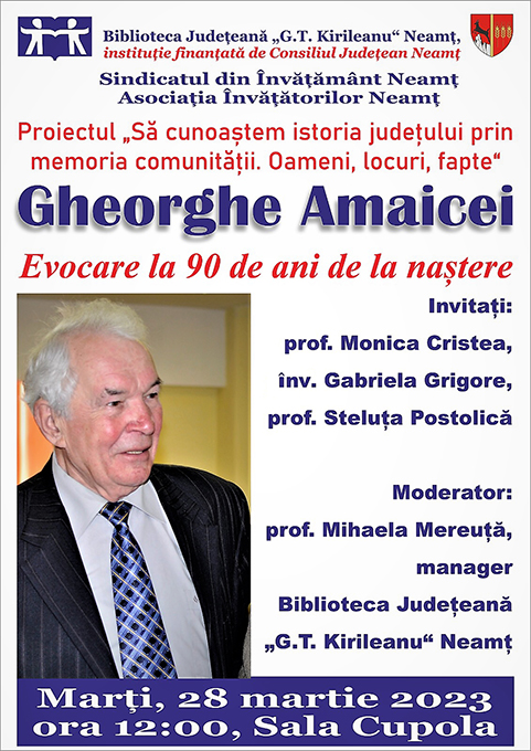Din respect, din recunoştinţă s-a implicat în multiple activităţi dedicate eroilor neamului, în mod special învăţătorilor care şi-au pierdut viaţa în timpul războiului. Ştiaţi că bădia Ghiţă a fost maior în rezervă? În această calitate a devenit membru în Conducerea Filialei Neamţ a Asociaţiei Naţionale Cultul Eroilor „Regina Maria”. Omul acesta n-a uitat niciodată că înaintea fiecărei generaţii a fost o alta, care a netezit drumul pentru cei ce au să vină. Ofiţerul Gheorghe Amaicei a răspuns prezent, la toate chemările asociaţiei, şi-a plecat fruntea spre amintirea eroilor şi a ridicat creştetul să privească spre viitor. Dar viitorul se naşte din trecut. Bădia simte că mai are o datorie, de aici s-a născut ultima iubire.