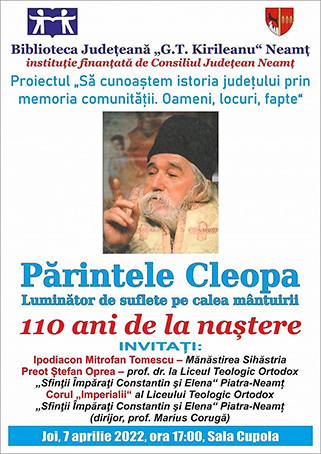 În cadrul proiectului „Să cunoaştem istoria judeţului prin memoria comunităţii. Oameni, locuri, fapte”, Biblioteca Judeţeană „G.T. Kirileanu” Neamţ a organizat simpozionul „Părintele Cleopa – Luminător de suflete pe calea mântuirii”. Evenimentul a avut loc joi, 7 aprilie 2022, în Sala Cupola.