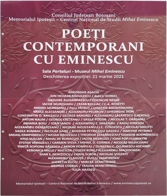 Biblioteca Judeţeană „G.T. Kirileanu” Neamţ găzduieşte, în perioada 25 mai – 25 iulie 2021, expoziţia itinerantă „Poeţi contemporani cu Eminescu” organizată de Memorialul Ipoteşti, Centrul Naţional de studii „Mihai Eminescu”, Botoşani. Expoziţia a fost vernisată la Botoşani pe 21 aprilie 2021, cu ocazia Zilei Mondiale a Poeziei.
