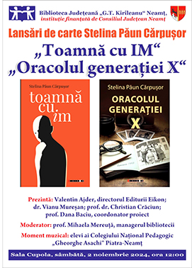 Biblioteca Judeţeană „G.T. Kirileanu Neamţ” a organizat lansarea cărţilor „Toamnă cu Im” şi „Oracolul Generaţiei X” de Stelina Păun Cărpuşor, sâmbătă, 2 noiembrie 2024, de la ora 12:00, în Sala Cupola. Ambele cărţi sunt apărute la Editura Eikon Bucureşti, prima recent, iar cea de-a doua în 2022.