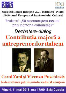 încheiat vineri, 11 mai, odată cu dezbaterea-dialog care a omagiat excelenţa profesională, desfăşurată în cadrul proiectelor „Să ne cunoaştem trecutul prin memoria comunităţii!” şi „2018: Anul European al Patrimoniului Cultural” – „Contribuţia majoră a antreprenorilor italieni Carol Zani şi Vincenzo Puschiasis la dezvoltarea patrimoniului cultural nemţean”.