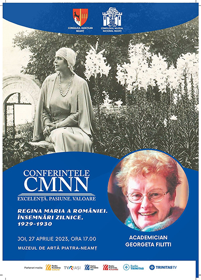 Georgeta Filitti, istoric, membru de onoare al Academiei Române, a fost invitata celei de-a treia ediţii a proiectului cultural-ştiinţific „Conferinţele CMNN”, organizat de Complexul Muzeal Naţional Neamţ. Evenimentul a avut loc joi, 27 aprilie, la Muzeul de Artă din Piatra-Neamţ, în prezenţa unui public numeros, pasionat de cunoaşterea trecutului. Tema conferinţei a fost „Regina Maria a României. Însemnări zilnice. 1929-1930”. Georgeta Filitti a fost însoţită de istoricul Stejărel Olaru, directorul Editurii Omnium. În luna noiembrie 2022, Editura Omnium a publicat un nou volum al Însemnărilor Reginei Maria sub îngrijirea istoricilor Georgeta Filitti şi Nicolae Pepene. Este vorba despre Însemnările zilnice ale anului 1930, păstrate la Arhivele Naţionale Centrale, care au fost traduse din limba engleză de Georgeta Filitti. Cu un an înainte, la Editura Corint, a apărut volumul „Regina Maria a României. Însemnări zilnice, 1929”, de asemenea tradus de Georgeta Filitti şi cu note consistente alcătuite de către istoricul Nicolae Pepene.