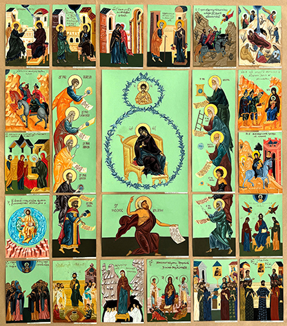 Lucrările copii au fost realizate de elevii secţiei Patrimoniu Cultural, clasele IX-XII, în cadrul orelor de restaurare icoană. Icoana cu ramă încadrată, înconjurată de scene, a fost împărţită în detalii mai mici, pe care elevii le-au reprodus. Bunavestire, Magii de la răsărit, Aducerea la templu, Iisus Hristos Mântuitorul, Sfinţii Părinţi, Urmaşii apostolilor, Maica Domnului bucuria celor necăjiţi, Preacinstirea Maicii Domnului, Duminica Ortodoxiei, Deisis, Fuga în Egipt, Închinarea magilor, Naşterea Domnului, Călătoria magilor, Maica Domnului şi dreptul Iosif, Vizita Maicii Domnului la Sfânta Elisabeta, Profeţii Avacum, Ieremia, Aaron, Moise, Profetul David, Profetul Balaam, Profetul Isaia, Profeţii Ezechiel, Iacob, Ghedeon, şi Daniel, Iisus Hristos Emanuel şi Maica Domnului pe tron. Documentarea a devenit astfel o lecţie nonformală pe tărâm artistic, istoria artelor, pictură, restaurare.