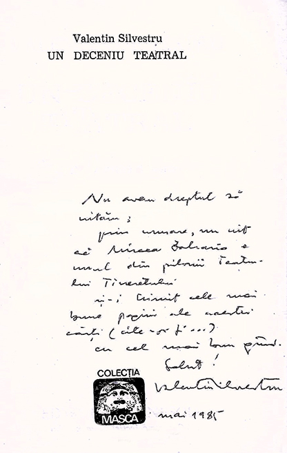 Valentin Silvestru (1924-1996) s-a format într-un mediu cultural în care tradiţia criticii literare interbelice coabita cu noile direcţii ale dramaturgiei moderne. A urmat studii de filologie şi s-a orientat către publicistica de specialitate, fiind prezent în mod constant în presa culturală. A colaborat cu reviste importante precum Teatrul, Contemporanul, România literară, Scânteia sau Flacăra, ajungând rapid o voce recunoscută şi atent urmărită, datorită clarităţii axiologice şi fermităţii criteriilor sale estetice. În paralel, a fost implicat activ în viaţa instituţională a teatrului, ocupând funcţii de conducere în structuri culturale şi fiind un susţinător consecvent al dialogului dintre critici, artişti şi public.