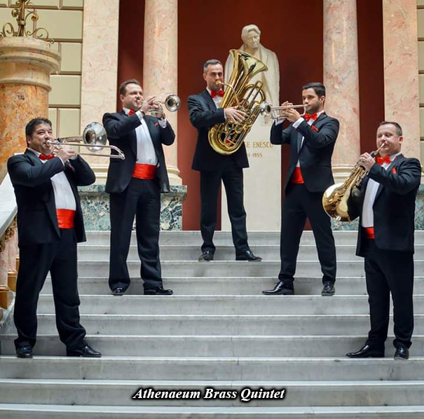 O seară deosebit de frumoasă şi agreabilă a oferit ansamblul Athenaeum Brass Quintet, formaţie camerală înfiinţată în anul 2003, în care stau alături instrumente de suflat din alamă (trompetă, corn, trombon şi tubă), pe care le mânuiesc cu talent, virtuozitate, sensibilitate şi mult umor instrumentişti din Orchestra Simfonică a Filarmonicii „George Enescu”, din Orchestra Naţională Radio şi de la Opera Naţională Bucureşti. Este vorba despre Oleg Răileanu – trompetă, Sebastian Burneci – trompetă, Ciprian Popa – corn, Cristian Lăbuş – trombon, Laurenţiu Sima – tubă.