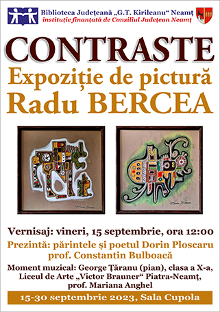 De un mare interes din partea publicului s-a bucurat expoziţia „Contraste” a pictorului bucovinean Radu Bercea, deschisă vineri, 15 septembrie, în Sala Cupola a Bibliotecii Judeţene „G.T. Kirileanu” Neamţ. Tematica amplă, profundă confirmă largile disponibilităţi artistice pline de dăruire, dragoste şi respect pentru creaţie ale autorului originar din Cernăuţi. „Cu toţii suntem martori ai timpului în care trăim. Eu las această mărturie sub formă de tablouri. Fac ce ştiu cel mai bine să fac şi ceea ce îmi place. Vin întotdeauna cu mare drag la Biblioteca Judeţeană „G.T. Kirileanu”, a spus Radu Bercea.