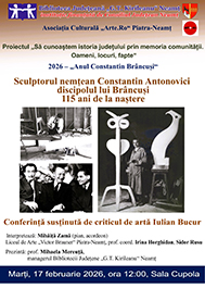 Biblioteca Judeţeană „G.T. Kirileanu” Neamţ, în parteneriat cu Asociaţia Culturală „Arte.Ro” Piatra-Neamţ, l-a omagiat pe „Sculptorul nemţean Constantin Antonovici, discipolul lui Brâncuşi, la 115 de ani de la naştere”, marţi, 17 februarie 2026, cu începere de la ora 12:00, în Sala Cupola.