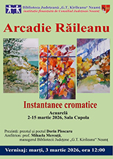 Pictorul basarabean Arcadie Răileanu a prezentat o suită de acuarele, cu titlul „Instantanee cromatice”, pe simezele Sălii Cupola a Bibliotecii Judeţene „G.T. Kirileanu” Neamţ, până la mijlocul acestei luni, în care dezvăluie, cu distincţie, farmecul naturii.