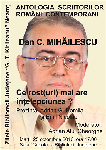 19-ap193-foto1Scriitorul Dan C. Mihăilescu a fost prezent pe data de 25 octombrie la Sala „Cupola” a Bibliotecii Judeţene „G. T. Kirileanu”, unde a susţinut conferinţa „Ce rost(uri) mai are înţelepciunea?”. Invitatul special al Zilelor Bibliotecii, prezentat publicului de către scriitorii nemţeni Adrian G. Romila şi Emil Nicolae, a intrat în dialog cu publicul, pledând pentru înţelepciune şi cele mai importante resurse ale ei, cărţile.