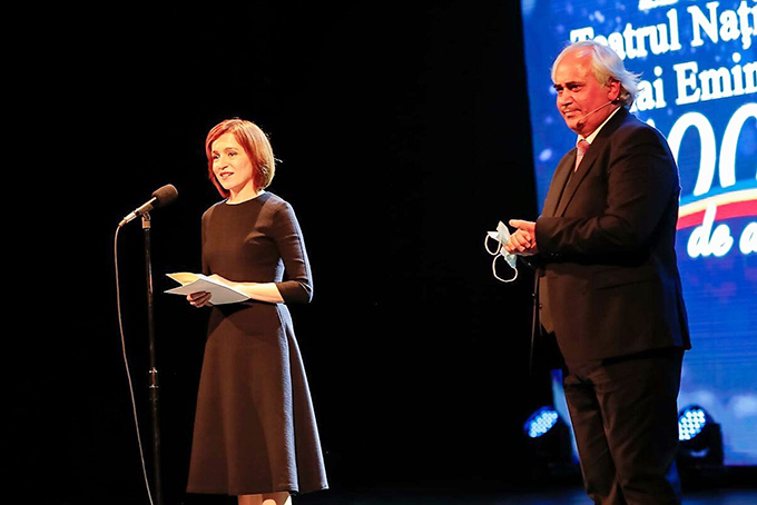 Am urcat cu emoţie pe această scenă, a mărturisit Preşedinta Maia Sandu, aşa cum am urcat pe 15 ianuarie, atunci când cu onoare am acceptat ca evenimentele acestei frumoase aniversări să se desfăşoare sub egida Preşedinţiei Republicii Moldova. A fost o bucurie reală atunci când, în mod simbolic, pe 27 martie, de Ziua Unirii cu România, am aflat că domnul preşedinte al României Klaus Iohannis s-a alăturat acestei iniţiative. Şi cu această ocazie, mulţumesc frumos încă o dată României pentru că sprijină proiectele culturale din Republica Moldova.(…) În discursul său, Preşedinta Republicii Moldova a elogiat figurile legendare ale teatrului care au făcut istorie şi au schimbat istoria, exprimându-şi respectul pentru înaintaşii artei teatrale din Moldova, dar şi pentru efortul şi talentul echipei de astăzi a Teatrului Naţional, nume care, cu siguranţă, vor rămâne gravate în istoria scenei naţionale. Astfel, pentru ca vorbele să fie acoperite de fapte au fost conferite câteva titluri onorifice unor nume notorii ale acestui teatru pentru merite deosebite în dezvoltarea şi promovarea artei teatrale naţionale şi a valorilor universale ale culturii, pentru talent remarcabil dedicat scenei şi rezistenţă în faţa provocărilor epocii, pentru asumarea misiunii de cultivare a limbii române, precum şi cu prilejul marcării a 100 de ani de la fondarea Teatrului.